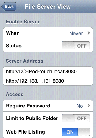 With the above settings, no one can use the server to copy files from the device. This also means that you can not connect to the server to copy files to the device. To get files to the device, you can download files from a web server where you have placed the files.
