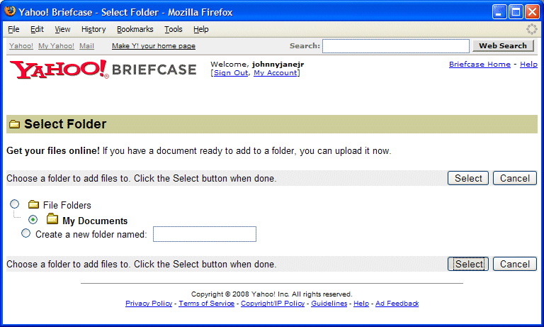 Yahoo! Briefcase to where you want to upload files. In the screenshot